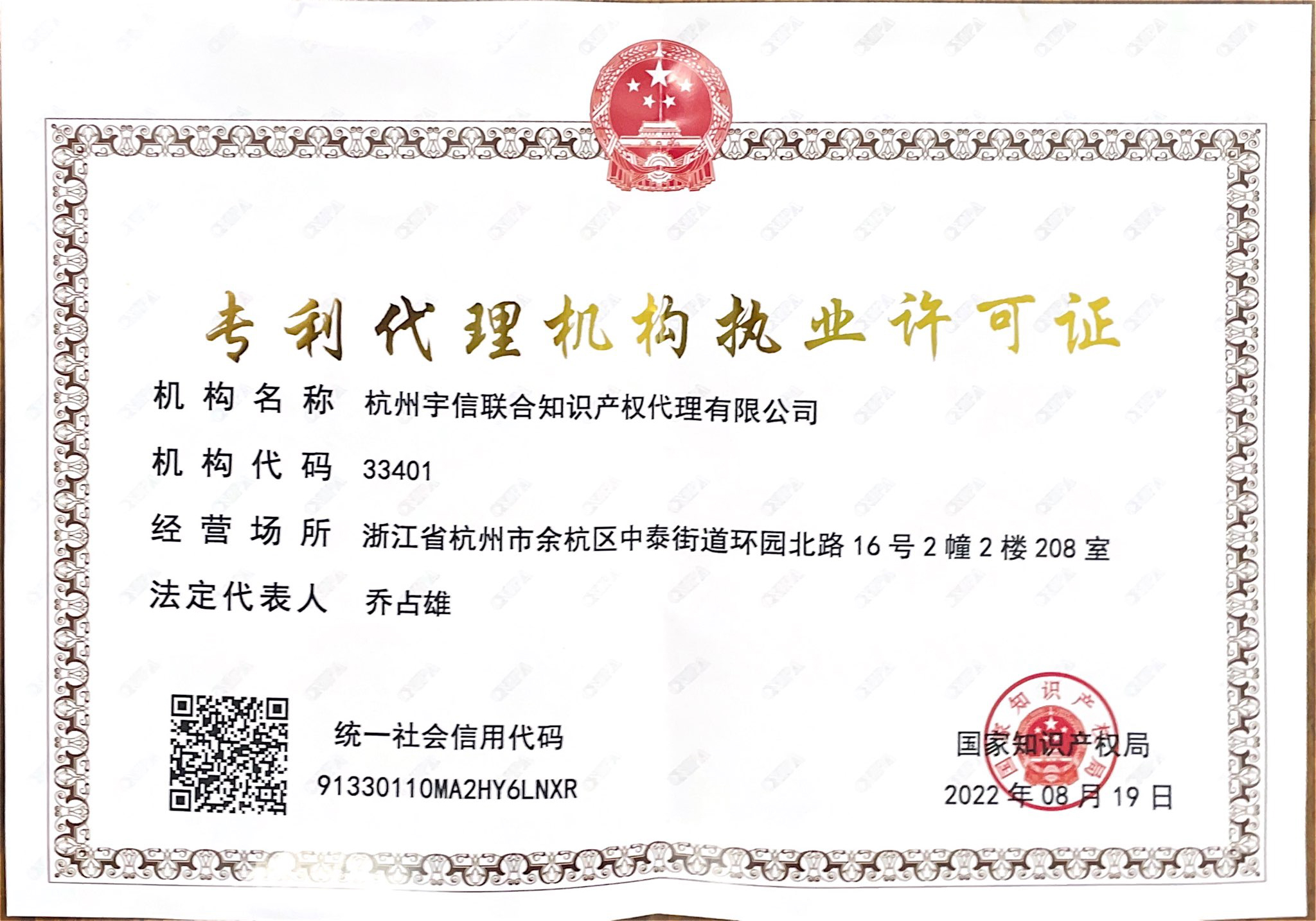 執(zhí)業(yè)許可證-宇信聯(lián)合知識(shí)產(chǎn)權(quán)